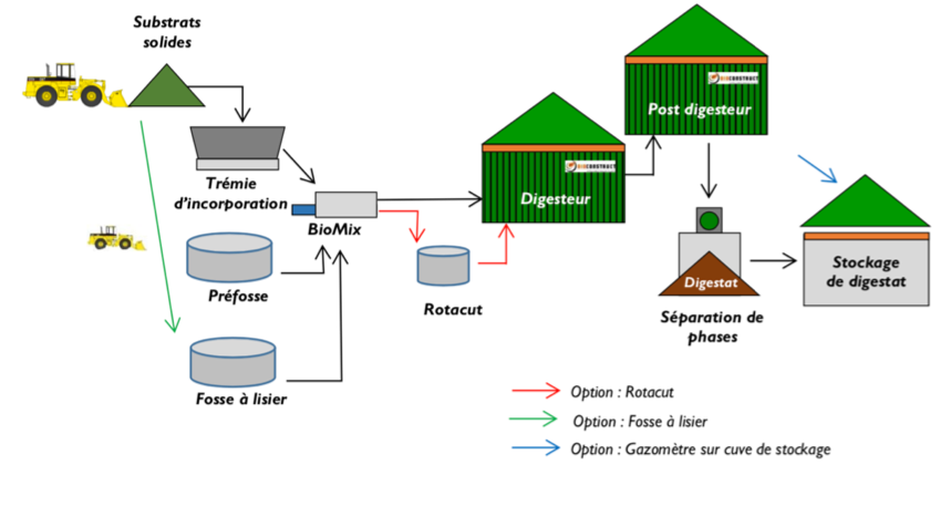 Après fermentation anaérobie dans les cuves, le digestat est acheminé vers l’unité de séparation de phases. La phase solide tombe sur une dalle en béton tandis que la phase liquide est envoyée dans la cuve de stockage. Une partie de cette phase liquide peut être envoyée vers le digesteur avant de diluer les substrats qui y sont incorporés.